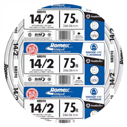 Superior electrical cable with copper electrical wire for residential electrical wiring projects. 14 AWG Romex SIMpull NMD90 with Freeze Flex includes 2 copper conductors and one ground wire. Use it for grounded receptacles in electrical outlet wiring, combo switch receptacles, wall switches, light switches and dimmer switches, lighting fixtures, ceiling fans, freezers, refrigerators, dishwashers, washing machines, exhaust fans and other household appliances. Romex SIMpull features Southwires NoLube SIM technology which has revolutionized the way wire is pulled into conduit without any pulling lubricant, saving contractors both time and money. Romex SIMpull NMD90 electrical cable pulls 50% easier, is tear resistant, reduces burn-thru and strips easier. Freeze Flex gives you more pliability, easier stripping and added crack-resistance in cold weather.